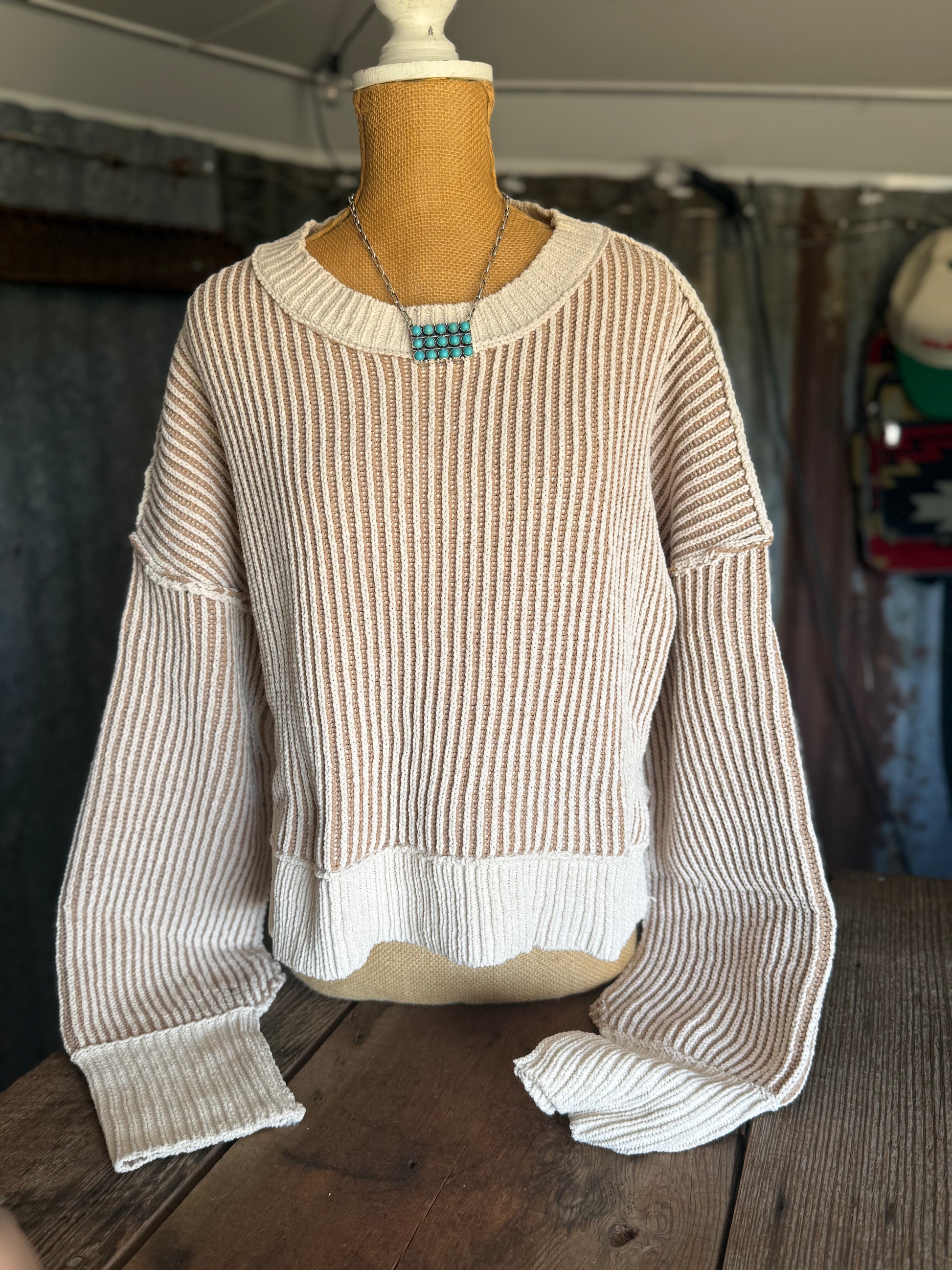 Two Toned Ribbed Sweater Top - Oatmeal